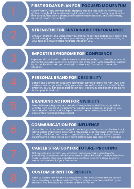 Let's connect and explore what Flawed + Fierce looks like for you in 90-Day Sprints to maximise impact in your new role.